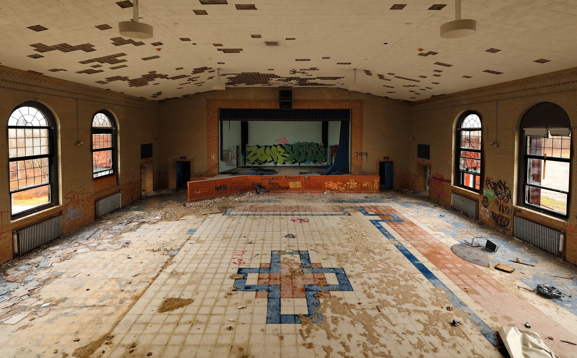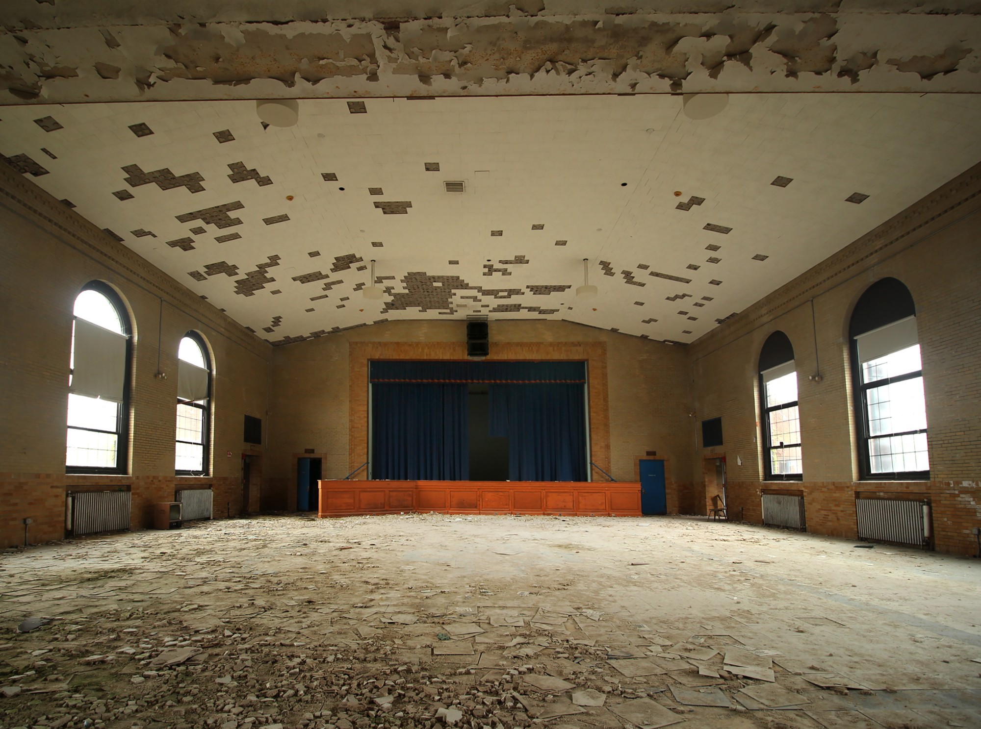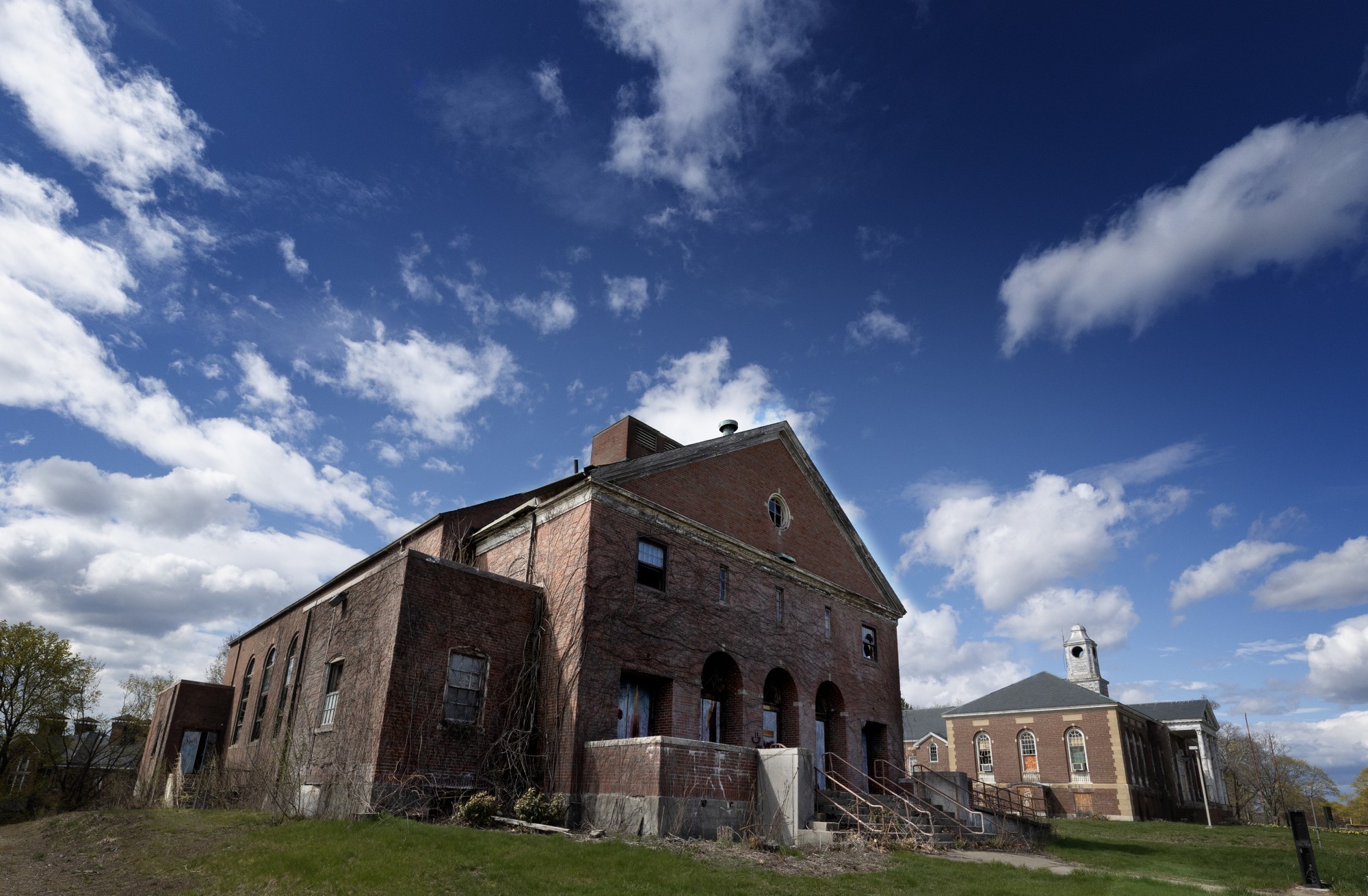 The Colonial Revival-style Howe Hall was built in 1933 as a large venue for entertainment (movies, plays, dances, etc.), as well as religious services (until the construction of the Chapel). Previously these services took place in the Gymnasium, which conflicted with physical training activities as the school grew in size. Howe Hall was naturally located near the other core services such as the kitchen, laundry, and administration building, also built around the same time, creating a central campus along a wide boulevard. Inside, a generously-sized stage could host performances and a movie screen, while dressing rooms and a beauty parlor were located in the rear. Chairs were not affixed to the main theater floor so it could double as a dance hall. A mezzanine level and projection booth is located on the second floor. Its basement was used as a canteen and later a copy center. As with the library, Howe Hall was named in honor of Samuel Gridley Howe, the founder and superintendent of the institution when it was first founded in Boston.