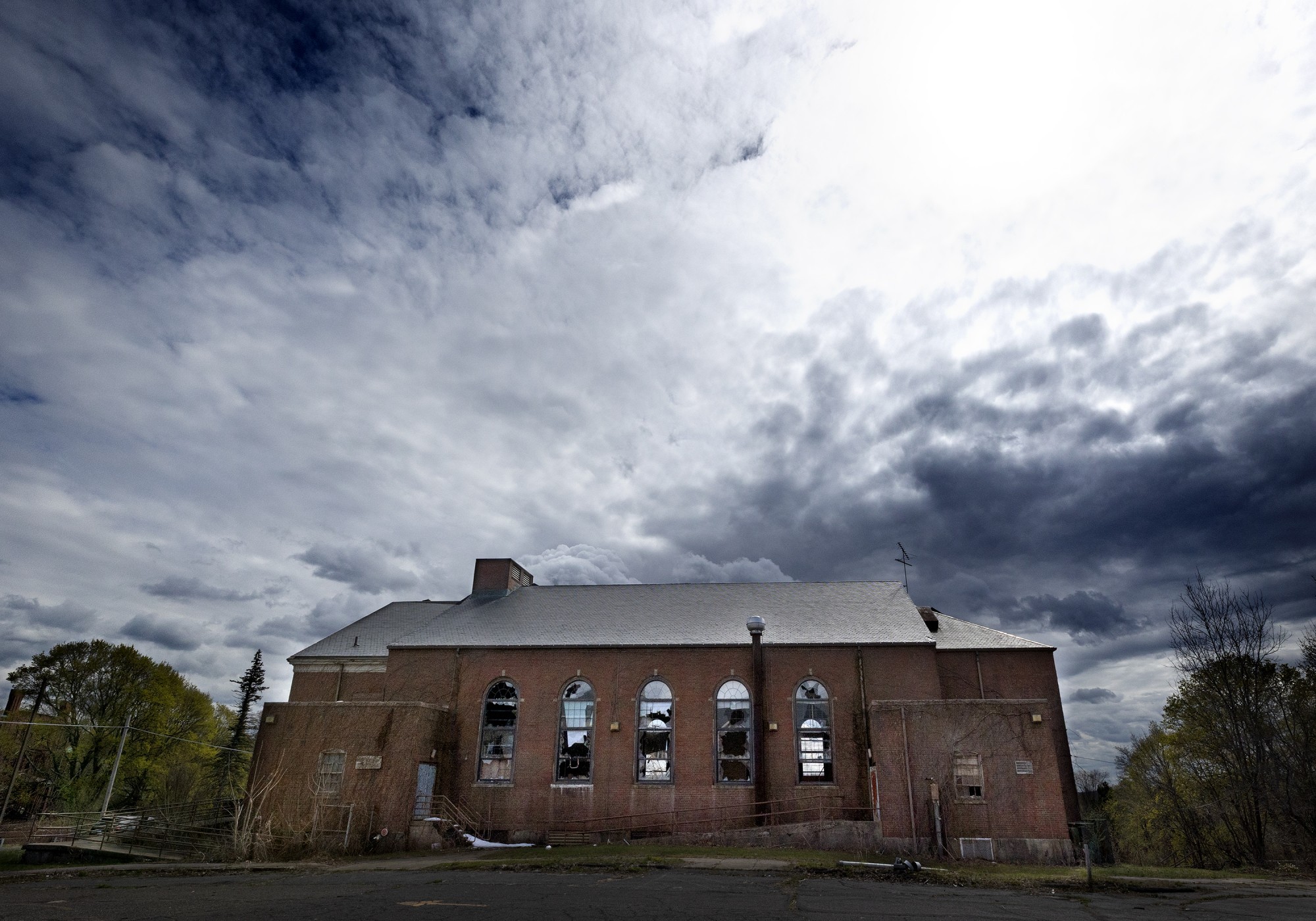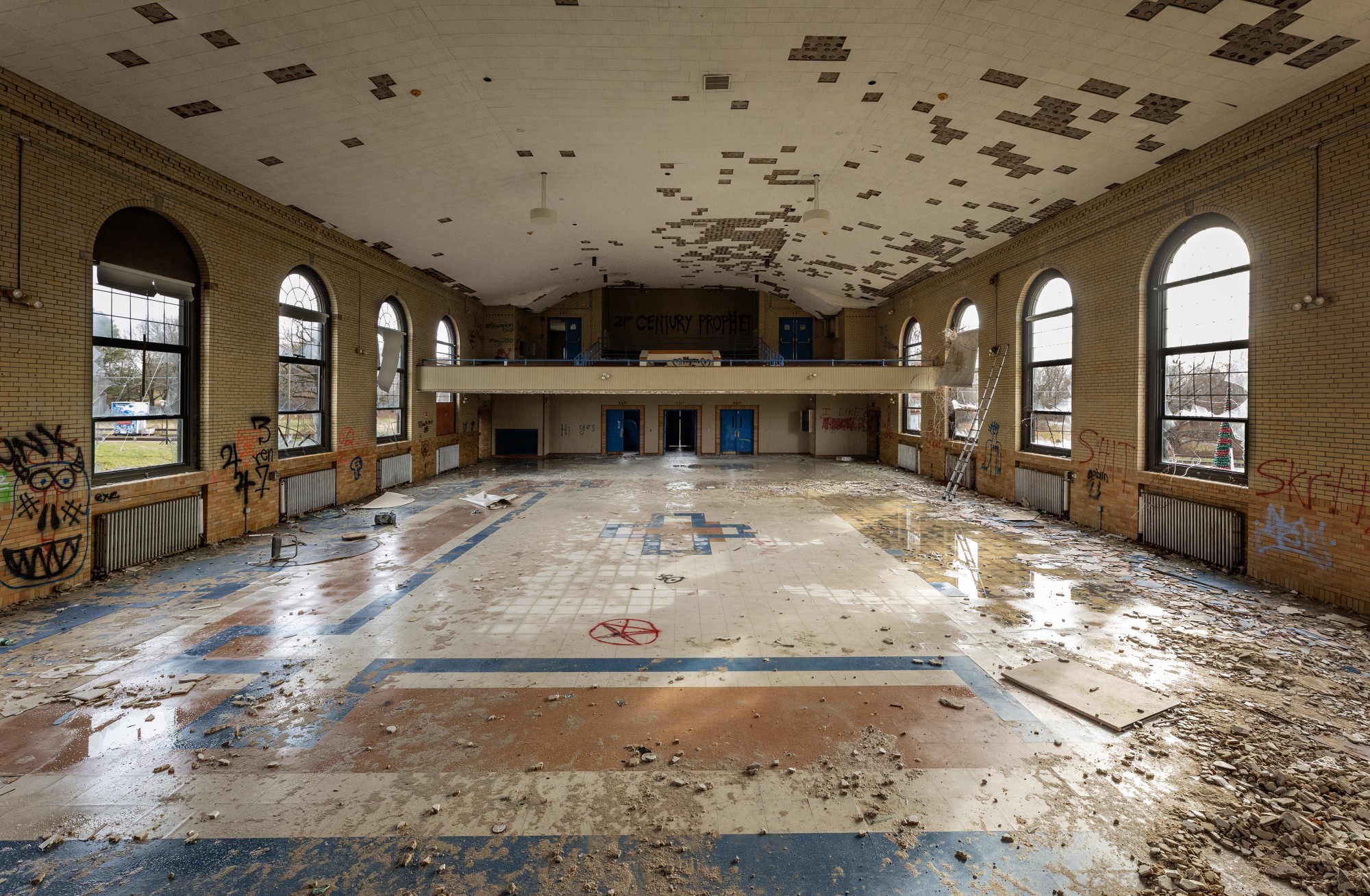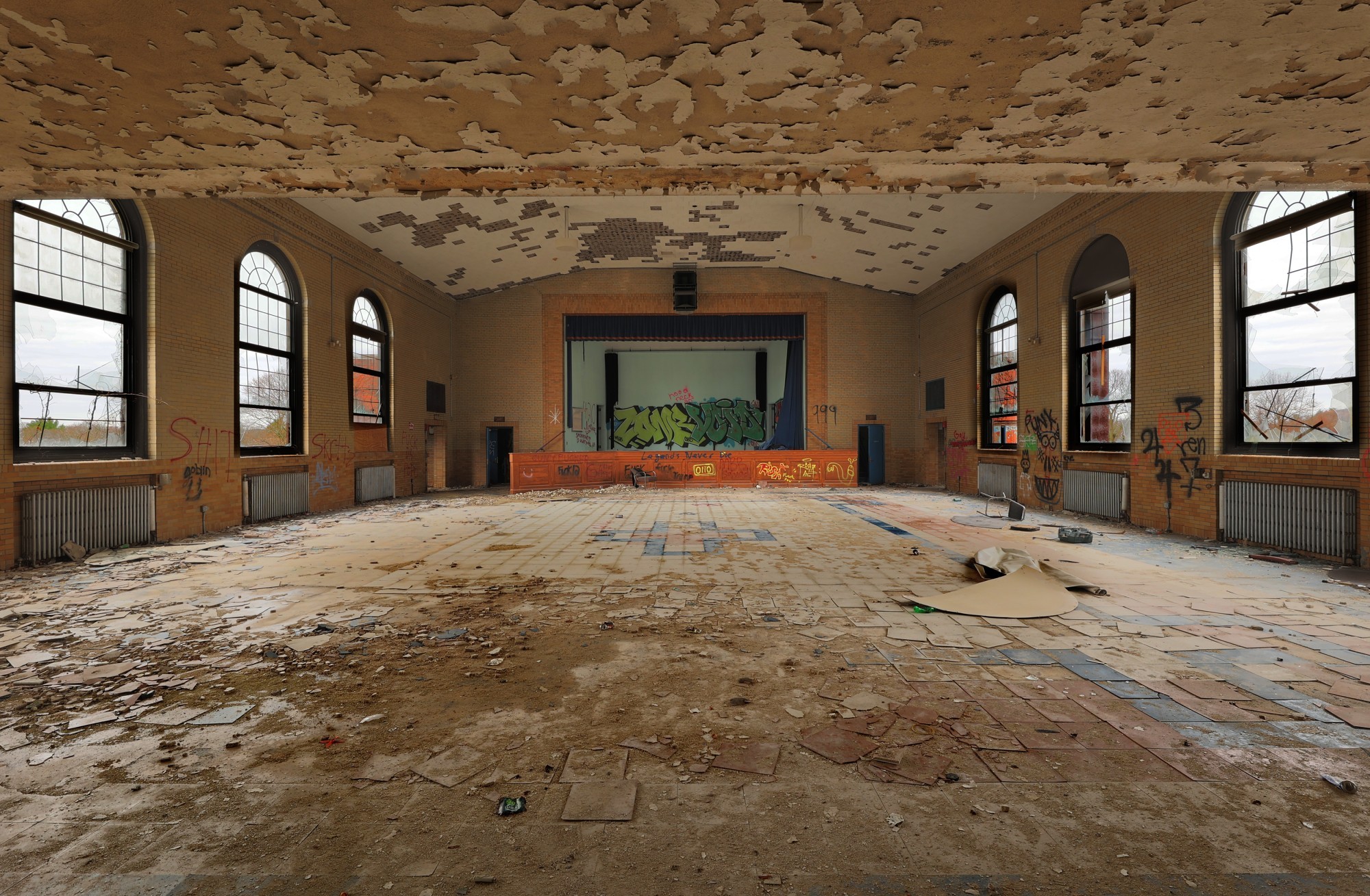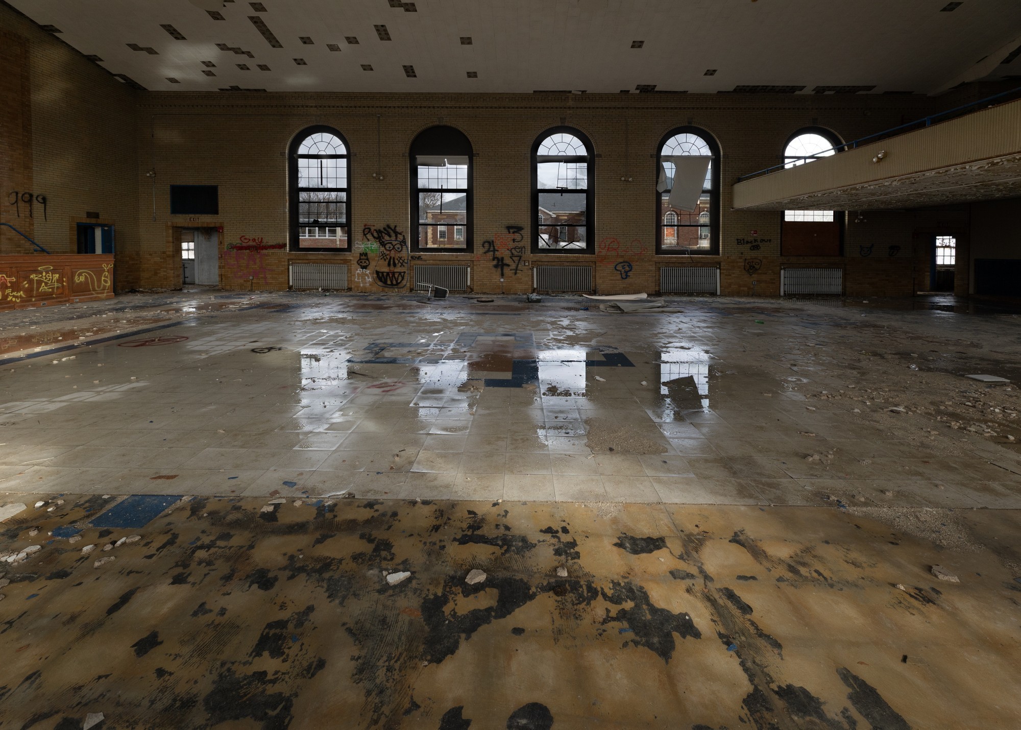 The Colonial Revival-style Howe Hall was built in 1933 as a large venue for entertainment (movies, plays, dances, etc.), as well as religious services (until the construction of the Chapel). Previously these services took place in the Gymnasium, which conflicted with physical training activities as the school grew in size. Howe Hall was naturally located near the other core services such as the kitchen, laundry, and administration building, also built around the same time, creating a central campus along a wide boulevard. Inside, a generously-sized stage could host performances and a movie screen, while dressing rooms and a beauty parlor were located in the rear. Chairs were not affixed to the main theater floor so it could double as a dance hall. A mezzanine level and projection booth is located on the second floor. Its basement was used as a canteen and later a copy center. As with the library, Howe Hall was named in honor of Samuel Gridley Howe, the founder and superintendent of the institution when it was first founded in Boston.